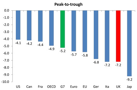 | Which major economy has performed the worst since 2007? Who gets the prize? It’s Italy, the ninth largest economy in the world. Italy’s real GDP in Q3 2013 was some 9% below where it was at the end of 2007. And the next worst is the UK, now 1.3% down (Q4 2013). But which country’s workers have suffered the most in lost incomes and jobs since 2007? The prize goes to the UK, the 6th largest, with a combined loss of over 7%. What the comparative data show is that real GDP in the UK underwent the joint-second largest contraction of the G7 economies during the 2008-09 economic downturn. Following the global financial shock, GDP in the UK fell by 7.2% between Q1 2008 and Q2 2009; this was the joint-second largest peak-to-trough fall among G7 economies. This is bigger than the fall in GDP in the G7 economies on average and bigger than in the European Union.